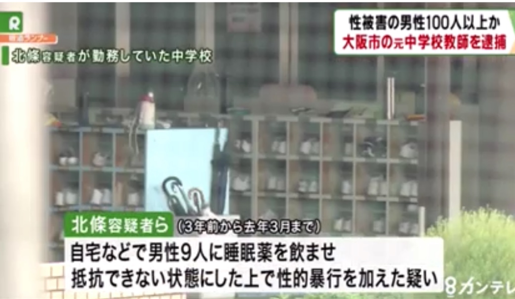 2020年9月3日に大阪市の中学校元教諭が2017年3月から2019年3月の間にSNSを使って20代〜40代の8人の男性に睡眠薬を飲ませ、暴行やわいせつ行為をしたとして北條隆弘(ほうじょうたかひろ)容疑者が逮捕されました。