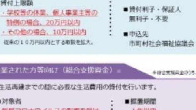 コロナウイルス対策の無利子貸付金である生活福祉資金貸付制度の受付は、各市区町村の社会福祉協議会で3月25日から始まっています。